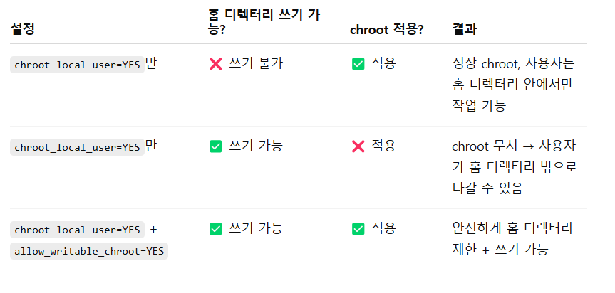 chroot_local_user=YES // 접속한 사용자의 홈디렉터리를 최상위 디렉터리가 되도록 설정allow_writable_chroot=YES //